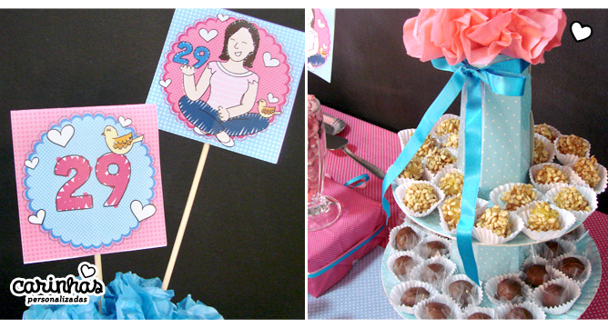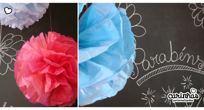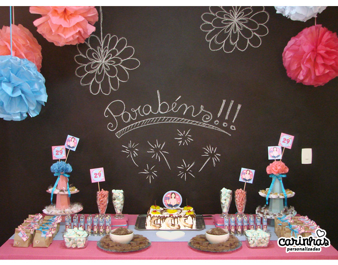 “Em casa de ferreiro, a festa é com Carinhas“! Pois foi assim que cuidamos da minha festinha de 29 anos que aconteceu ontem! O dia mesmo do aniversário é 22/07, mas para estarem todos os queridos presentes, mudamos para ontem! Que delícia preparar uma festa com a minha própria Carinha, rs! Escolhi as cores rosa e azul e pompons de papel seda apareceram de verdade (clique aqui aprenda a fazer), de giz e mini-pompons!