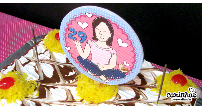Topo de bolo de papel Carinhas no meu bolo favorito da Maria Torta! O Bê viu meu desenho e logo observou: “tem um passarinho no seu joelho!“… fofo!!