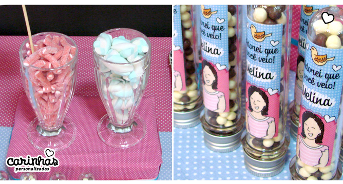 O Rapha teve a ideia de colocar guloseimas nas cores da festa dentro de copos altos e o palitinho também ajudou a decorar!