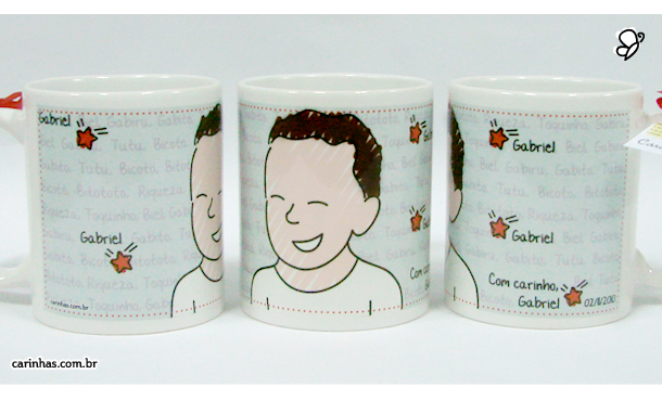 A caneca foi feita com um monte de apelidos carinhosos do Gabriel no fundo! Adoro essa ideia dos apelidos… também tinhamos feito assim para a Maria Clara!