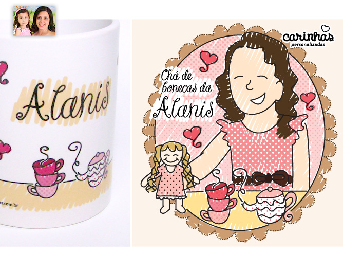 Duas lindas: a Alanis e sua mamãe Fernanda! Cada uma ganhou uma Carinha pra chamar de sua. A Alanis no tema querido e fofura garantida: chá de bonecas. O resultado foi apaixonante e, nas palavras da Fernanda: “Aprovadíssimo!”