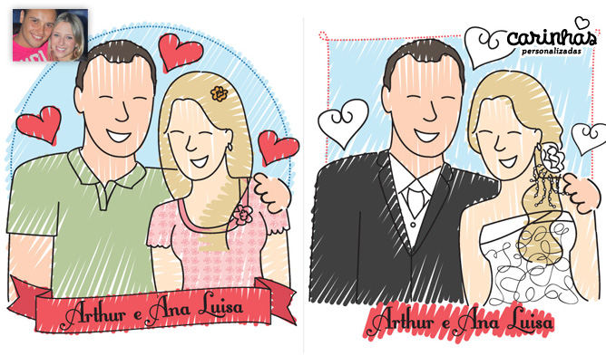 A Ana Luisa e o Arthur são de Santana do Parnaíba/SP! O casal escolheu as Carinhas para participar desse momento feliz que é o casamento. Adoramos fazer o desenho com troca de roupas porque o casal sempre tem a sensação de que está pronto para o grande dia ao ver essa transição! E também adoramos saber como será o vestido e cabelo das noivas antes de todo mundo, confesso! ;)