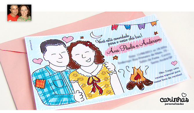 Eu dei pulinhos quando a Ana Paula contou que o chá bar dela e do Anderson seria uma festa junina! Eu e Rapha adoramos uma quermesse! Esse clima colorido cheio de caldinhos quentes, fogueira e bandeirolas é tudo de bom, né?! As Carinhas no convite do chá já davam o clima do Arraiá!
