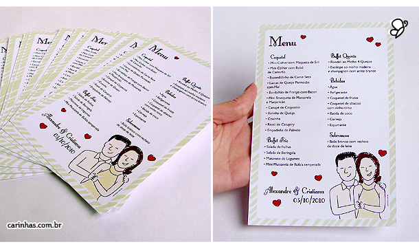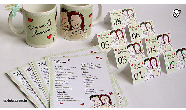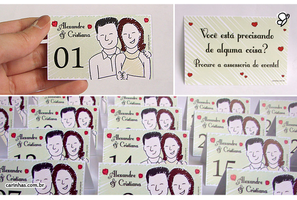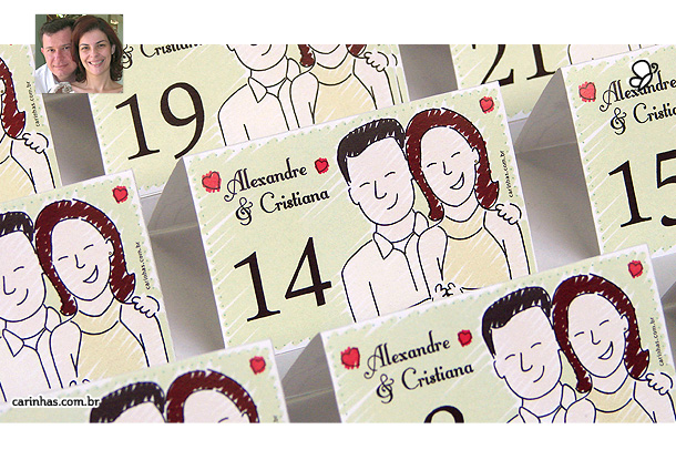 Essa noiva querida (que já é uma casadinha hoje!) acabou de festejar seu grande dia neste sábado! É a Cris, de São Paulo, que de cliente virou amiga e nossos casamentos tiveram muita coisa em comum, inclusive as Carinhas! Elas apareceram no marcador de mesa: