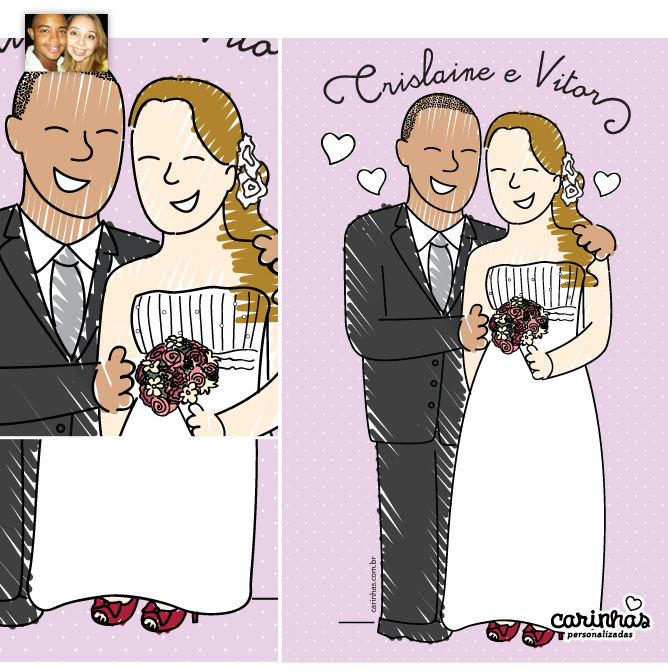 Como já comentamos por aqui antes: não somos ciumentos! Isso significa que você pode fazer o desenho conosco e escolher um fornecedor pertinho de você para fazer os produtos assim como fez o casal carioca Cris e Vitor! Basta optar apenas pelo item “Desenho de Carinha” na nossa loja virtual!