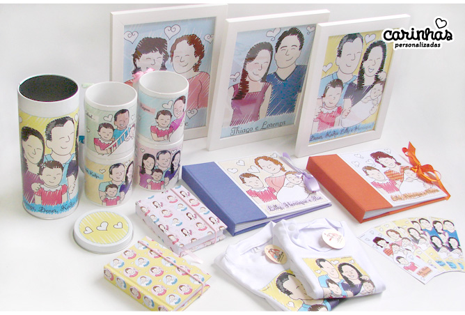 O Thiago e a Lorenza ganharam um kit com suas Carinhas em: uma caneca, dois marcadores com a família toda, um quadrinho e uma agenda pequena by Maria Papel!