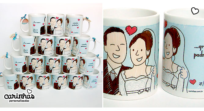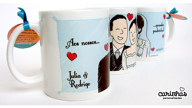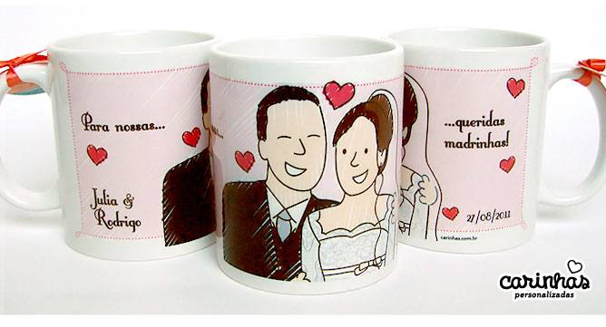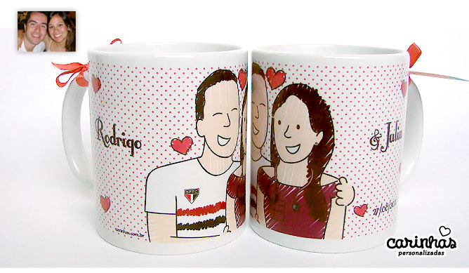 O casamento da Julia e do Rodrigo aconteceu agora no finalzinho de agosto em São Paulo! Pra começar, o casal encomendou Carinhas com roupas comuns: o Rodrigo devidamente uniformizado como bom torcedor do São Paulo e a Julia com seu inseparável estetoscópio rosa, pois ela é médica e está fazendo Residência em Pediatria! O casal apareceu em canecas!