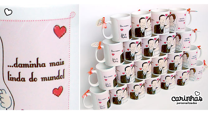 Já vestidos de noivos e prontos para o grande dia, a Julia e o Rodrigo apareceram mais canecas! As com fundo rosa foram para presentear as mulheres: desde a avó querida, passando pela mamãe e madrinhas até a daminha fofa!