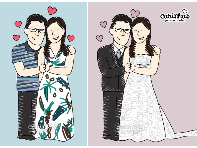 A Silmara não perdeu a chance de fazer suas Carinhas com roupas comuns e também vestidos de noivos! Tenho achado o maior barato fazer o casal com roupas comuns iguais as da foto… o efeito fica super bacana, né?