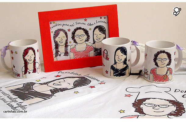 Cada caneca com um detalhe da personalidade: um jardim com joaninhas para Si, bolsas sapatos e brincos para Luciana e Dona Edna fazendo delícias entre ingredientes, panelas e colheres!