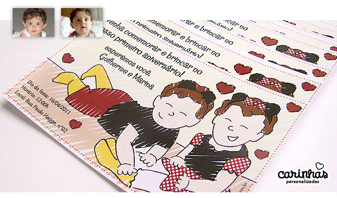 A Sibelli queria que os gêmeos fofos Marina e Guilherme fossem retratados no tema Mickey e Minnie! Olha que gracinha a dupla brincando enquanto convida os amiguinhos para a festa de 1 aninho com o convite simples!