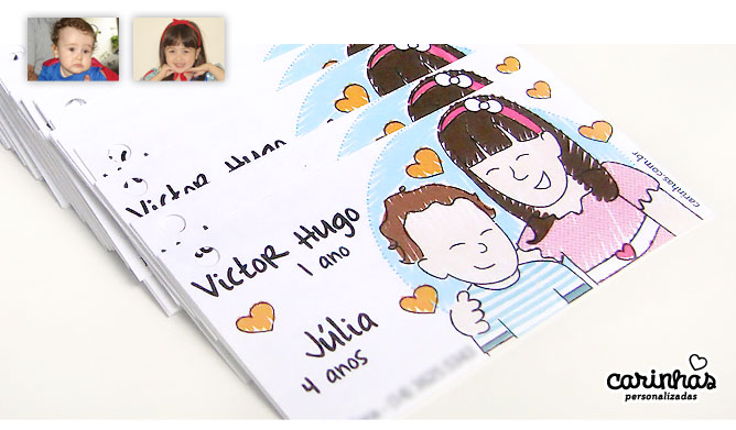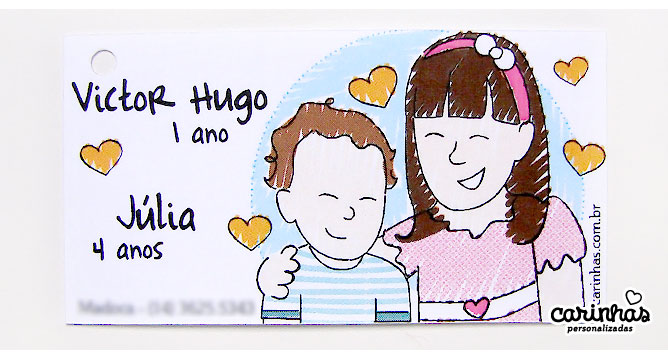 O Victor Hugo completou 1 aninho e a sua irmã Júlia completou 4! As suas Carinhas apareceram abraçadinhas enfeitando a festa e as lembrancinhas… fofura define bem, né? :)
