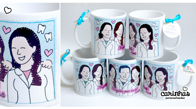 Todo mundo tem guardados no coração os professores da faculdade que mais marcaram! A Danielle foi além do agradecimento e encomendou as Carinhas dos seus mestres de Odontopediatria e Ortodontia: Izabel, Fernanda, João, Patrícia e Daniela. As Carinhas foram parar no produto mais pedido por aqui: canecas!