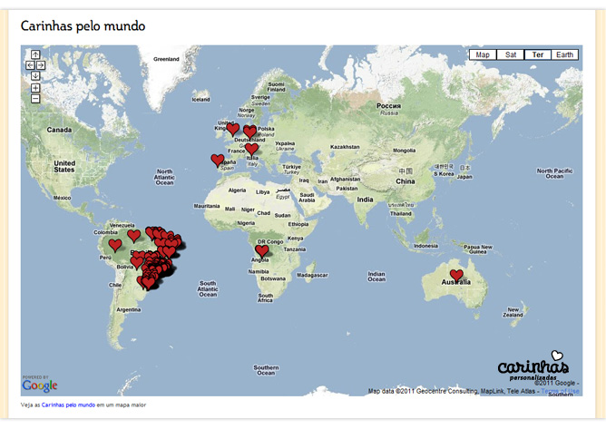 Nela, você vai encontrar um mapa mundi marcado, com amor, aonde nossas Carinhas já foram parar! Basta clicar no coração e, em seguida, na imagem da Carinha que aparecer e você será direcionado ao post sobre essa Carinha no nosso blog! Bacana, né? Uma realização da xcake, que nos ajuda a realizar nossos sonhos mais loucos! Obrigada, pessoal! ;)
