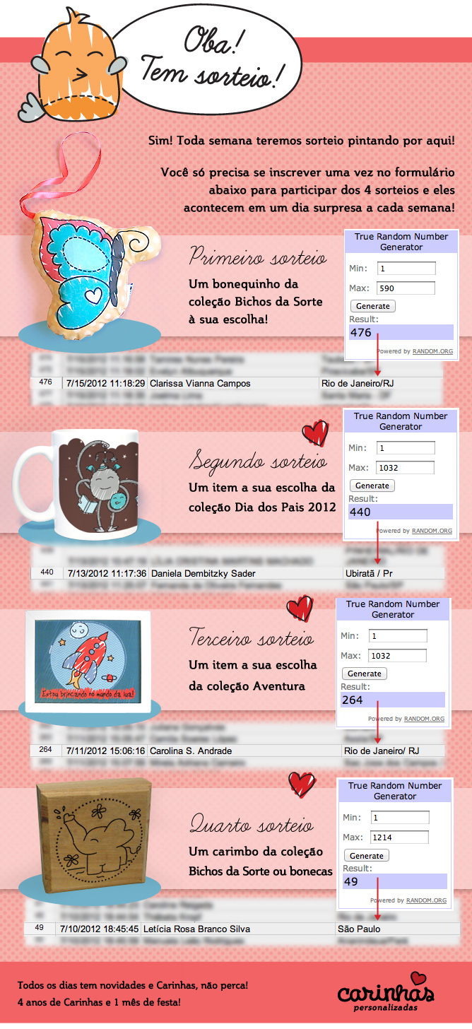 Chegamos ao último resultado com o feliz número de 1214 participantes! Muuuuito obrigada! :D A nossa última ganhadora foi a Letícia Silva, de Sampa! Parabéns, Letícia!
